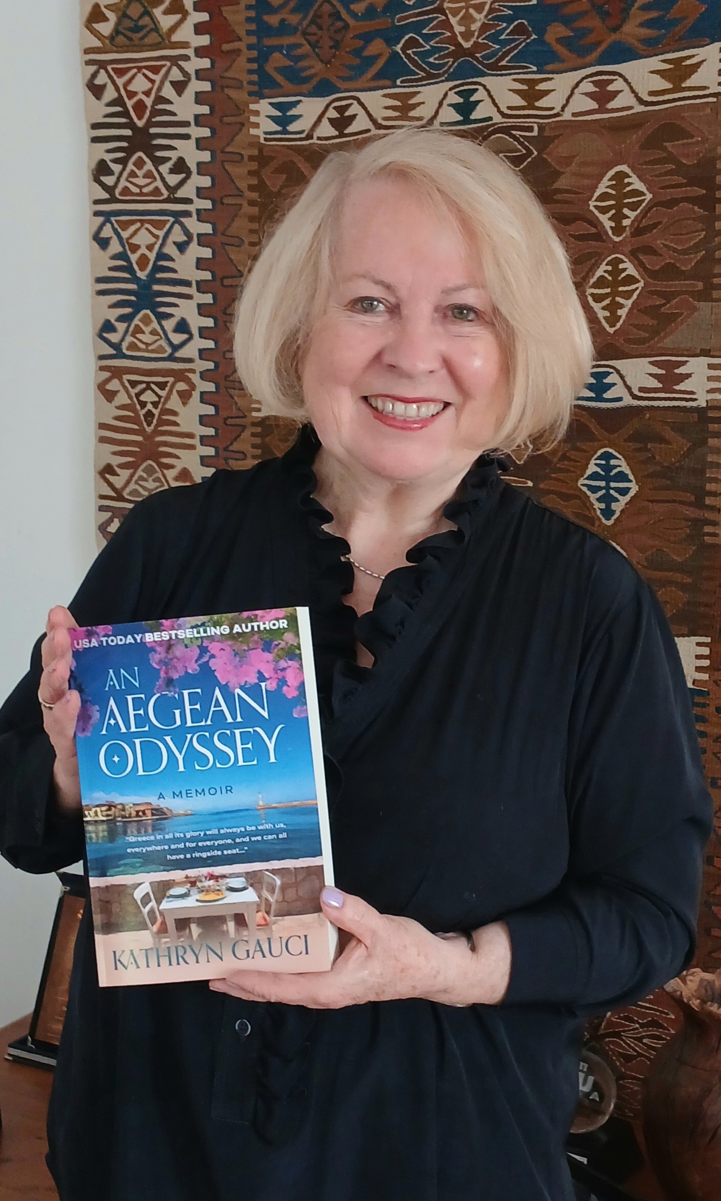 Kathryn Gauci with her book, An Aegean Odyssey