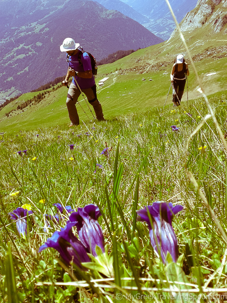 Minutes after we leave behind us the snake-like tarmac and continue ascending in a lush meadow with low vegetation, going smoothly uphill -but undoubtedly uphill. The heat is now unbearable, I feel.